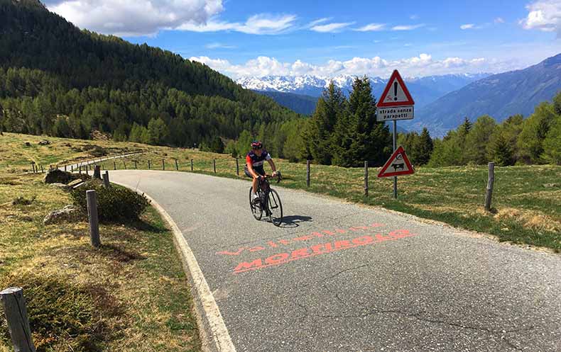 Our second and longer ride option will be amazing, beginning with an early start that sees us shoot down the 30km’s to Mazzo di Valtellina and to the base of Passo del Mortirolo, before taking a left turn to take on our first challenge of the day, Mortirolo. We’ll pass the monument to Marco Pantani as we roll up the mercilessly steep gradients that hit 18% and average 10.4% for the 11.5km duration.