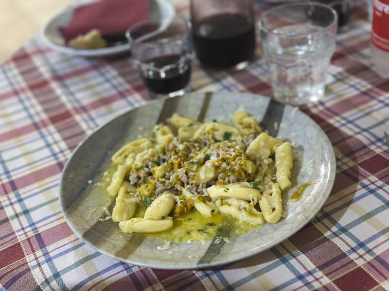 • Strangolapreti pasta with zucchini flowers, pork sausage and scamorza cheese