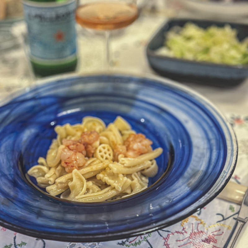 • A homemade pasta of 5 different shapes, with a delicate fish broth and topped with raw local red prawns